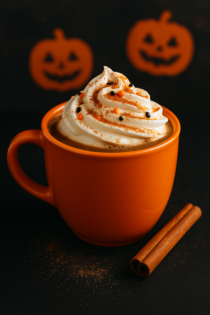 Finish with whipped cream, a dusting of cocoa or cinnamon, and a few Halloween touches — like orange sprinkles or a drizzle of dark chocolate syrup.