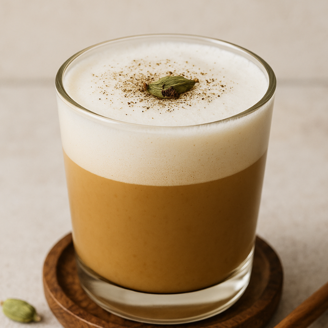 - Froth the spiced milk (or whisk vigorously until slightly foamy).